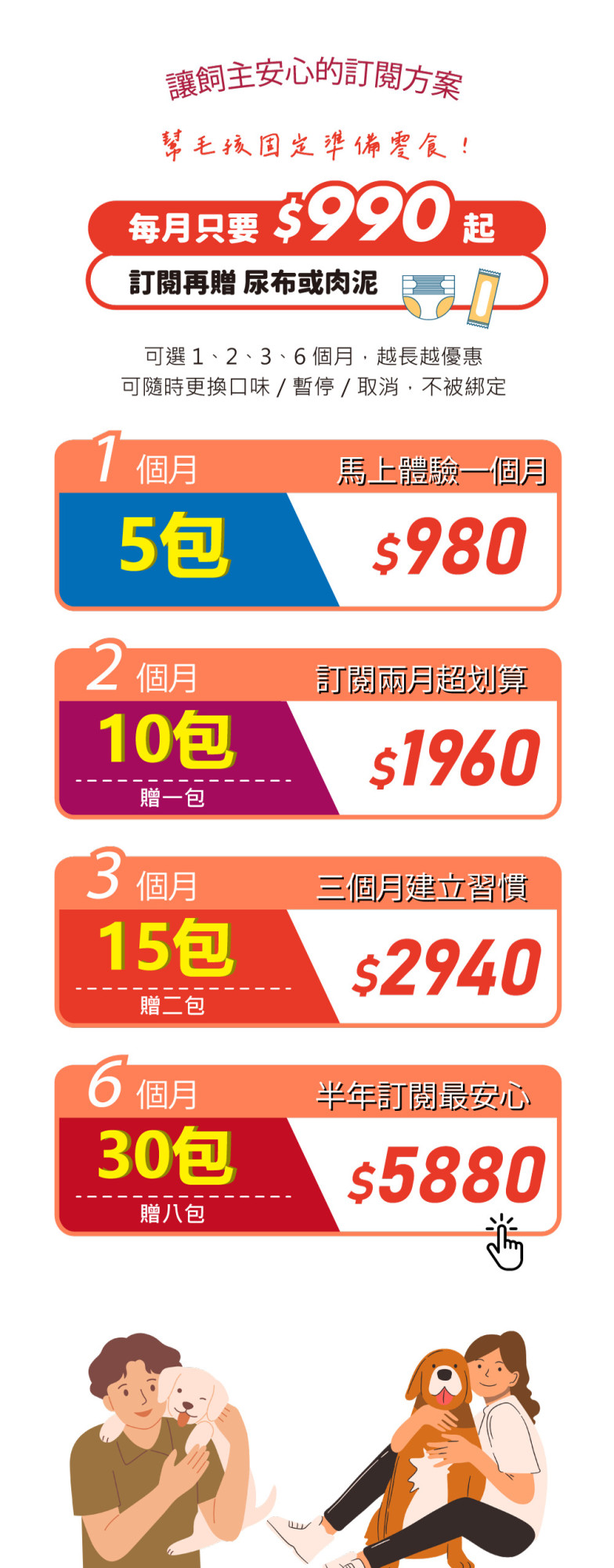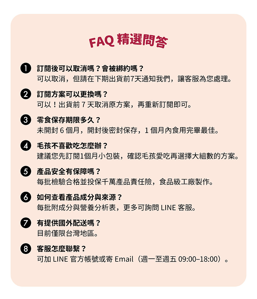 比起一次買一堆、吃不完又怕不合適,訂閱制讓你用更聰明的方式照顧毛孩,固定補給、彈性調整,讓毛孩吃個安心,飼主更放心!