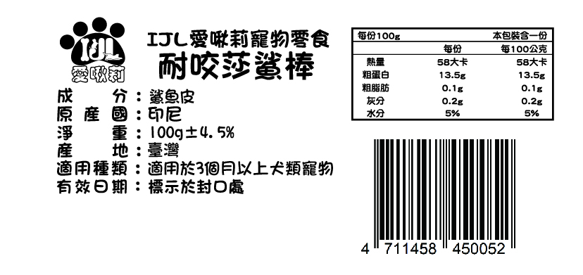特色:海之耐咬系鯊魚皮,超豐富膠原蛋白,淡淡腥香味會讓犬毛孩垂涎三尺,成分天然讓犬毛孩吃得健康,又能達到磨牙效果